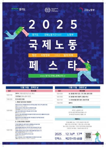 경기도가 국제노동기구(ILO), 고용노동부와 함께 12월 16일과 17일 이틀간 ‘청년, 지방정부 그리고 일의 미래’를 주제로 ‘2025 국제노동페스타’를 고양 킨텍스 제2전시관에서 개최한다.